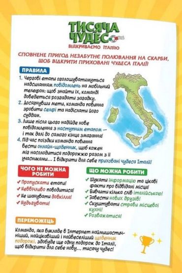 Усім їм надійшла мишастична (мишачою мовою це означає «фантастична») пропозиція взяти участь у перегонах «Тисяча чудес», щоб відкрити скарби Італії. Тож команда Стілтонів вирушає до Італії, щоб об’їхати всі двадцять регіонів від Лаціо до Венето і розгадувати