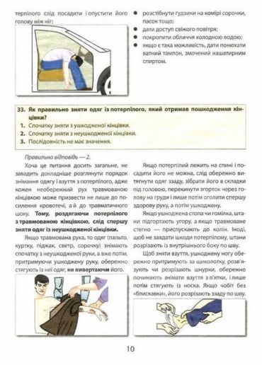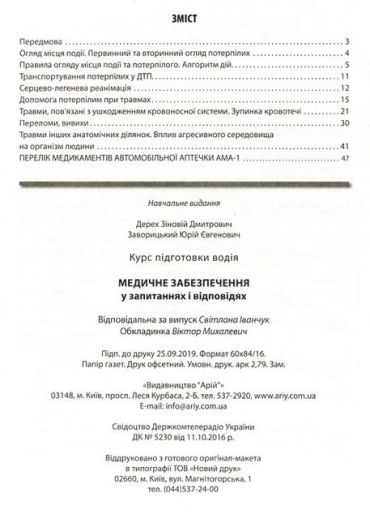Зокрема розглядаються питання щодо різних видів травм потерпілих унаслідок дорожньо-транспортних пригод, їхнього транспортування і надаються коментарі до правильних відповідей на екзаменаційні питання та корисні поради лікарів з урахуванням сучасних методик надання домедичної допомоги.