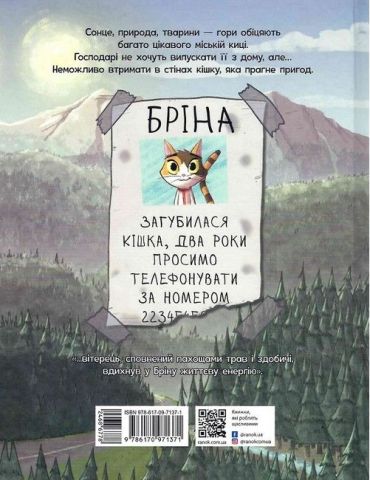 Кішка Бріна зі своїми господарями вирушає у відпустку в гори. Тут вона почувається щасливою, дикою, вільною… Аж поки її не садять на повідець — щоб не загубилася. Та хіба можна втримати душу, яка жадає пригод? Бріна тікає з дому і вступає до угруповання безпритульних котів, які зневажають людей і всіх, хто їм підкорюється… Цей графічний роман не про людей і котів (хоча вони тут чудові, як і гірські пейзажі). Він про тонку межу між особистими кордонами і родинними стосунками.