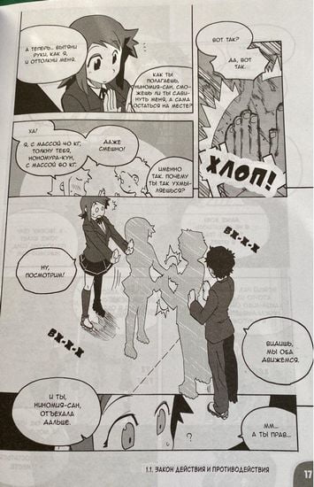 Цю цікаву книгу ніяк не назвеш підручником фізики, хоча в ній, як і годиться добропорядній підручником, вводяться основні поняття класичної механіки. Кожна глава книги починається коміксами, а закінчується повторенням і уточненням отриманих знань. Замість сухих формул і примітивних прикладів тут герої книги вирішують свої «гострі» проблеми. Симпатичний призер олімпіади з фізики Ріота пояснює своїй однокласниці-спортсменці і невиправною фантазерці Мегумі, чому їй не вдається гра в теніс. Тогдато і з'ясовується, що гра в теніс, стрибки у висоту, їзда на велосипеді, — скрізь снують ці «дивні хлопці» з підручника фізики — сила, імпульс, енергія та ін Так ненав'язливо ти разом з Мегумі дізнаєшся про всеместном вплив законів руху і закону всесвітнього тяжіння Ньютона, закону збереження імпульсу, закон збереження енергії. Ти познайомишся з векторами, векторними діаграмами та їх властивостями, зі способами пересування в космосі, з методами розрахунку відстаней з допомогою графіків, при цьому ти, можливо, несподівано для себе виявиш, що, виявляється, вмієш обчислювати інтеграли.