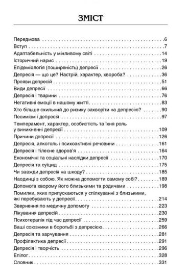 Кожен зможе знайти в цій книзі те, що зробить його впевненішим, гармонійнішим, обізнанішим. А головне, книга дасть потрібні відомості про, мабуть, найпоширеніший і серйозний розлад нашої психіки — депресію.
