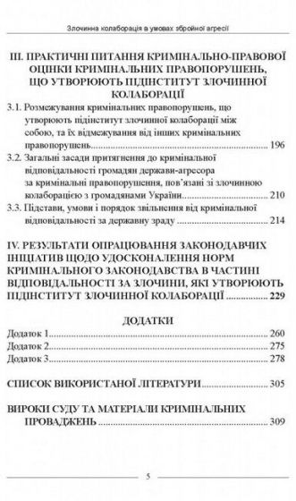 Запропоноване видання зорієнтовано на практичне використання та вирішення суперечностей у кримінально-правовій оцінці кримінальних правопорушень, що утворюють підінститут злочинної колаборації. Робота розрахована на її використання співробітниками слідчих та оперативних підрозділів СБУ, суддями, працівниками інших правоохоронних органів. Може бути корисною для курсантів, студентів, аспірантів та викладачів закладів вищої освіти, науковців, сфери наукових інтересів яких стосується зазначена тематика.