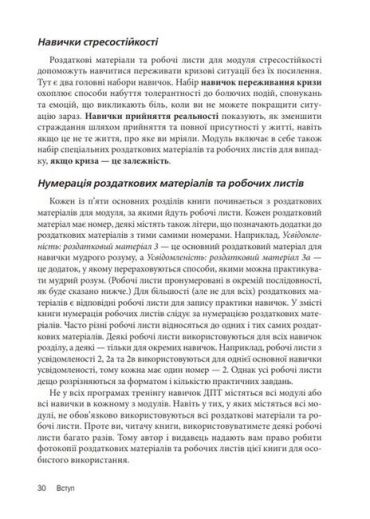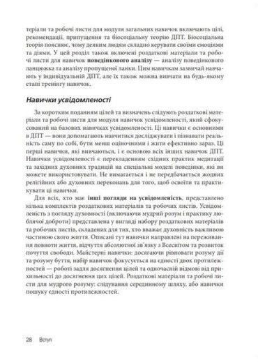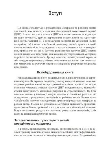 Книга є збірником робочих листів і роздаткових матеріалів, за допомогою яких змінюється досвід, що травмує, та формуються здорові реакції на дистрес. ДПТ поєднує в собі елементи класичної психотерапії, практики дзен, діалектичний підхід та когнітивно-поведінкові методики. Під час цієї терапії клієнти набувають навичок ефективного спілкування та навчаються долати стрес, використовуючи навички усвідомленості - постійного включення в реальність.