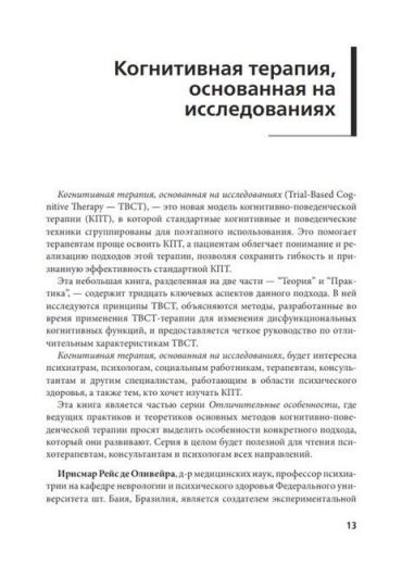 “Книга Ирисмара Рейс де Оливейры — выдающийся вклад в КПТ. С самого начала становится совершенно ясно, что автор — мастер-клиницист. Де Оливейра разработал инновационный, мощный, структурированный подход, который может помочь клиницистам изменить проблемные стили мышления и поведения. Книга написана в очень доступной манере, читателю предоставляются бесчисленные клинические методы и примеры. Всем, кто интересуется новыми рубежами когнитивной терапии, будет полезно прочитать данное руководство и использовать изложенные в нем творческие идеи. Я настоятельно рекомендую это творческое новое дополнение к библиотеке когнитивной терапии для клиницистов любого уровня квалификации”.