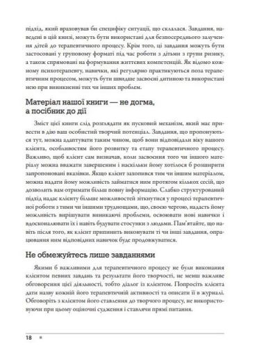Книга є збіркою вправ для підкріплення традиційних методів когнітивно-поведінкової терапії та сприяє розвитку у дитини соціальних навичок. На відміну від традиційної психотерапії у цій книзі мовленнєва взаємодія доповнюється невербальною активністю, сприяючи особистісному зростанню дітей, які мають труднощі з рефлексією та зміною негативних думок. В основу книги покладено знання та досвід шкільних психологів, соціальних працівників та психотерапевтів.
