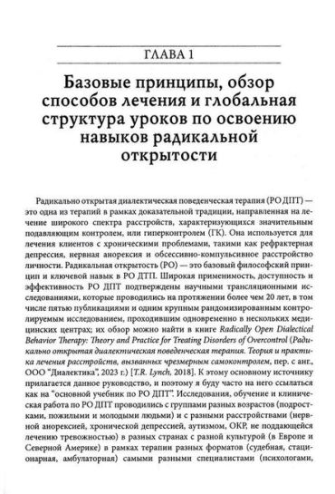 Это всеобъемлющее руководство по обучению ключевым навыкам радикальной открытости в рамках диалектической поведенческой терапии. Данные навыки направлены на помощь людям, которые страдают от проблем, связанных с чрезмерным самоконтролем, включая хроническую депрессию, нервную анорексию, расстройства аутического спектра, генерализированное тревожное расстройство, ОКР и пр.