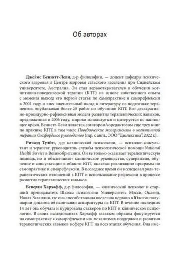 Авторы данной книги не только сами использовали предлагаемые ими методы, но и провели через этот процесс сотни терапевтов. Упражнения, рабочие листы и инструкции протестированы и разработаны для получения максимальной пользы от применения КПТ в самостоятельной практике. Включенные в книгу упражнения по саморефлексии помогут эффективно использовать полученные знания на каждом этапе работы.