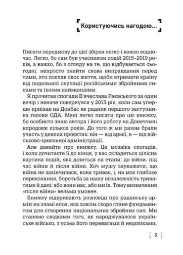 Анексія Криму та війна на Донбасі змінили життя тисяч українців. Частиною суспільства, яка була змушена у турбо-режимі пройти глибоку трансформацію, були українські військовики. Саме їм довелося над могилами своїх побратимів попрощатись із минулим, у якому російських військовиків не сприймали як ворогів. Ця книжка — спогади одного з таких українських офіцерів. Збірка оповідань В’ячеслава Раєвського цікава саме тим, що простежує військові реалії від часів занепаду Радянського Союзу, в нелегкі роки початків незалежності України та її армії і до російсько-української війни. Автор також дає широку панораму сучасного Донбасу, підконтрольного Україні.