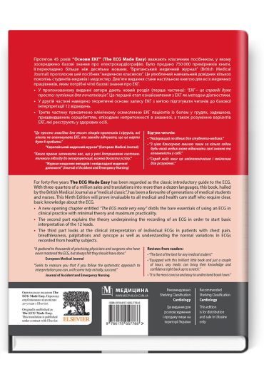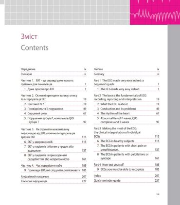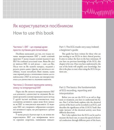 У посібнику «Основи ЕКГ» висвітлено принципи застосування ЕКГ для діагностики захворювань серцево-судинної системи. Видання може використовуватися як вступна частина до вивчення ЕКГ для тих, хто лише починає ознайомлюватися з цим методом діагностики. На прикладі ЕКГ реальних пацієнтів, записаних у 12 відведеннях, показано найпоширеніші порушення серцевого ритму й провідності та зміни, що виникають при різних захворюваннях серця. Однак базові вимоги залишаються незмінними: ЕКГ слід інтерпретувати з урахуванням скарг, анамнезу й результатів інших фізикальних досліджень. Видання складається з чотирьох частин. Перша частина — початковий етап ознайомлення з ЕКГ як методом діагностики. З мінімальним використанням теорії та максимальним обсягом практичного матеріалу описано найважливіші правила застосування ЕКГ у клінічній практиці. У другій частині наведено теоретичні основи запису ЕКГ з метою підготувати читачів до базової інтерпретації 12 відведень. Третю частину присвячено клінічному осмисленню ЕКГ пацієнтів із болем у грудях, задишкою, пришвидшеним серцебиттям й епізодами непритомності в анамнезі, а також розумінню варіантів ЕКГ, які реєструють у здорових осіб. Метою четвертої частини є перевірка і контроль знань, які читач мав змогу здобути в попередніх розділах, переконавшись у тому, що ЕКГ справді легко зрозуміти.