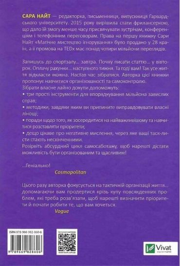 Запишусь до спортзалу… завтра. Почну писати статтю… у вівторок. Оплачу рахунки… наступного тижня. Та годі вам! Так усе життя відкласти можна. Настав час зібратися. Авторка цієї книжки пропонує навчитися організованості та самоконтролю.