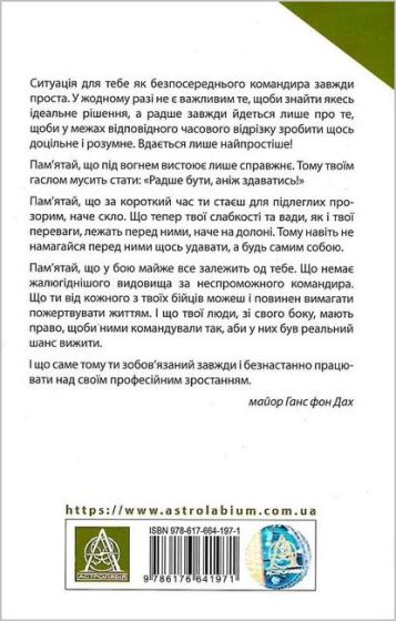 Професійний, але пристрасний текст військового фахівця і патріота має потужний мотиваційний потенціал, а доповнений рисунками, схемами і таблицями, він може бути легко засвоєний. Призначається для офіцерів, сержантів, рядових Збройних Сил України, а також усіх, хто хоче належно підготуватися до захисту своєї країни від агресії ворога та збільшити свої шанси на виживання у бою.