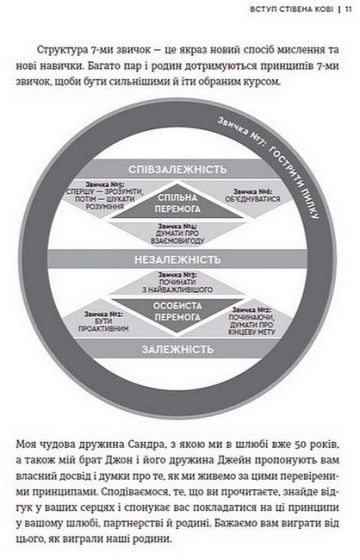Бурхливі часи вимагають сильних, відданих особистих стосунків, уважає автор книжок «Сім звичок високоефективних людей» та «12 важелів успіху» Стівен Річардз Кові. А здорове подружжя і родина – підвалини цивілізації, та цегла, з якої будується суспільство. Міцні стосунки не можуть просто відбуватися, вони потребують сукупної енергії, таланту і бажання усіх членів родини. Два подружжя родини Кові діляться у книжці своїм досвідом подружнього життя, наголошуючи на 7-ми основних звичках високоефективного шлюбу, які допоможуть визначити пріоритети у стосунках, будувати щасливе й ефективне подружнє партнерство, об’єднатися довкола спільної мети та мрій, бачити місію шлюбу і правильно розподіляти час між роботою та родиною.