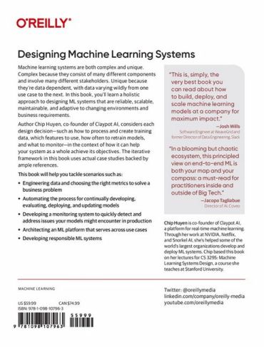 Author Chip Huyen, co-founder of Claypot AI, considers each design decision--such as how to process and create training data, which features to use, how often to retrain models, and what to monitor--in the context of how it can help your system as a whole achieve its objectives. The iterative framework in this book uses actual case studies backed by ample references.