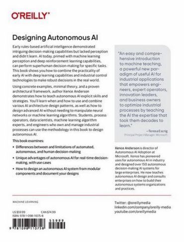 Using concrete examples, minimal theory, and a proven architectural framework, author Kence Anderson demonstrates how to teach autonomous AI explicit skills and strategies. You'll learn when and how to use and combine various AI architecture design patterns, as well as how to design advanced AI without needing to manipulate neural networks or machine learning algorithms. Students, process operators, data scientists, machine learning algorithm experts, and engineers who own and manage industrial processes can use the methodology in this book to design autonomous AI.