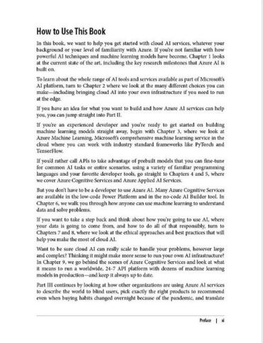 This book shows you how cloud AI services fit in alongside familiar software development approaches, walks you through key Microsoft AI services, and provides real-world examples of AI-oriented architectures that integrate different Azure AI services. All you need to get started is a working knowledge of basic cloud concepts.