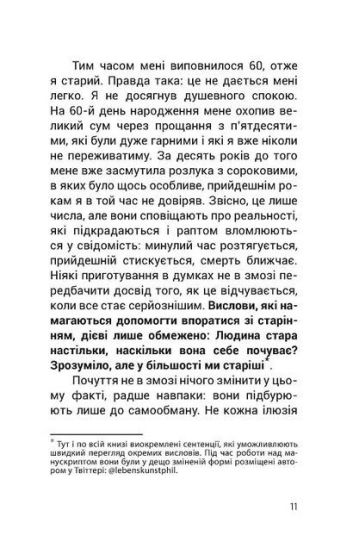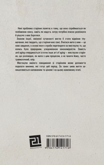 Ведучи мову на непросту тему старіння, Вільгельм Шмід дуже просто, зрозуміло, толерантно і водночас чесно розмірковує про цей неминучий і закономірний процес. Він пропонує десять кроків до душевного спокою. Його книга читається, як хоку під супровід звуків японської флейти, води, вітру, бамбукових дзвоників у японському саду, падіння листя дерев на водну поверхню. Це мистецтво - мистецтво старіння, мистецтво вмілого поводження зі старінням.