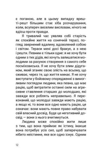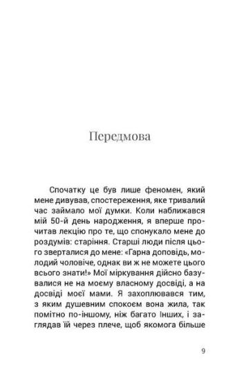 Вільгельм Шмід про досить непрості речі, явища, процеси говорить просто і зрозуміло, завжди тримаючи у полі зору співрозмовника. І книга ця справді варта уваги. Адже тема старіння не так часто обговорюється; більше того, у нашому суспільстві вона часто (чи навіть звично) обминається. Психологічно це зрозуміло: людина не воліє замислюватися над тим, що колись усе може змінитися, що її мотиваційно-вчинкові площини наповняться новими смислами. Але відштовхуючи ці думки щодо себе, людина не замислюється й над тими, для кого цей період життя вже актуальний, не помічає їх або дратується, не зважає на них. А таке ставлення лише ускладнює життя літнім людям. Намагаючись збагнути проблему старіння у зв’язку з собою, людина вчиться жити з цим процесом осмислено і зі смислом. Намагаючись збагнути проблему старіння у зв'язку поки що з кимось іншим, людина вчиться бути гуманнішою, чутливішою і співчутливішою, а також оберігає себе від травматичного сприйняття себе у майбутньому, у новій якості.