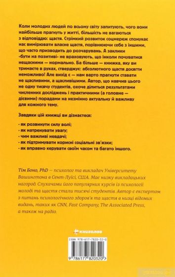 Викладач з психології Тім Боно вивчає бажання молодих людей і те, що робить їх щасливими. Він розробив курс “Позитивна психологія”, який став одним з найпопулярніших серед студентів, а згодом і написав книжку, в якій ділиться результатами своїх досліджень, історіями їх учасників і практичними та дієвими порадами як стати щасливішими і мати стратегію власного життя.