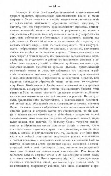 "В предлагаемом здесь вниманию читателя изъяснении Моисеева сказания о миротворении сочинитель имел целию показать, как надо понимать, во свете слова Божия, силу и значение тайны миротворения и сколько наука в настоящем ее состоянии достигла относительно этого предмета результатов, оправдываемых словом Божиим и взаимно служащих к большему раскрытию света слова Божия".