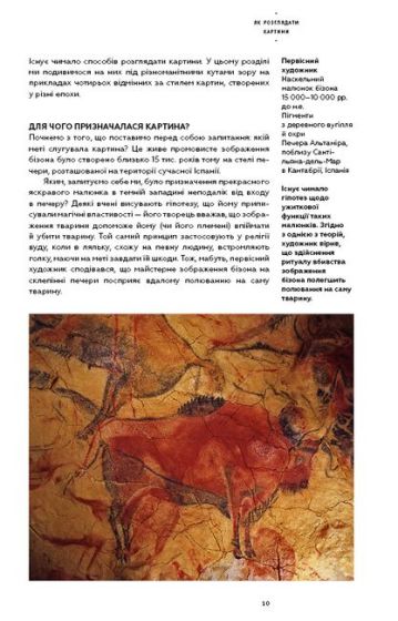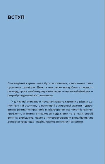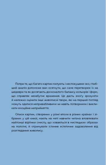 У цій книзі описано й проаналізовано картини з різних аспектів: розглянуто популярні в живописі сюжети й дивовижне розмаїття прийомів їх відтворення на полотні; технічні проблеми, з якими стикаються художники та в який спосіб вони їх вирішують, часто з неперевершеною винахідливістю долаючи труднощі; і навіть приховані смисли й натяки.