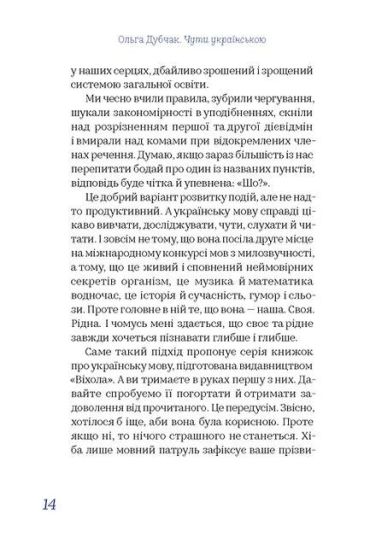 Книжка «Чути українською» не змушуватиме вас учити правила чи зубрити мовні закони. Це вже робила колись ваша вчителька української мови та літератури. Завдання книжки — пояснити, за якими правилами й закономірностями працює звукова система, а ще — чому наша абетка майже досконала. І, звісно, переконати вас, що українська мова — це надзвичайно цікаво, легко і місцями навіть корисно.