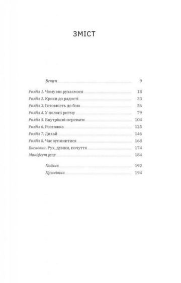 У цій книжці авторка зібрала новаторські наукові дослідження, філософію гуру йоги та досвід спортивних професіоналів. Рух не просто поліпшує якість життя, він допомагає нам мислити, що особливо важливо в процесі старіння. Звичайна ходьба покращує когнітивні здібності людини. А розтяжка сприяє зменшенню рівня тривожності та дратівливості. Відкриття, описані в цій книжці, можуть не лише позитивно вплинути на здоров’я окремих осіб, а й змінити все суспільство на ліпше. Годі вже сидіти! Додайте більше руху у своє життя — і ви відчуєте зміни на краще.