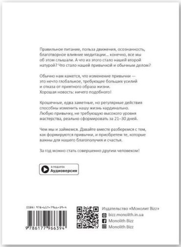 Крихітні, ледь помітні, але регулярні дії здатні змінити наше життя кардинально. Якщо ми робимо одне віджимання на день, це набагато краще, ніж якщо ми зовсім нічого не робимо. Процес вироблення звичок добре вивчений, розкладений на атоми, доступний для використання. Будь-яку звичку, яка потребує високого рівня майстерності, реально сформувати за 21–30 днів.
