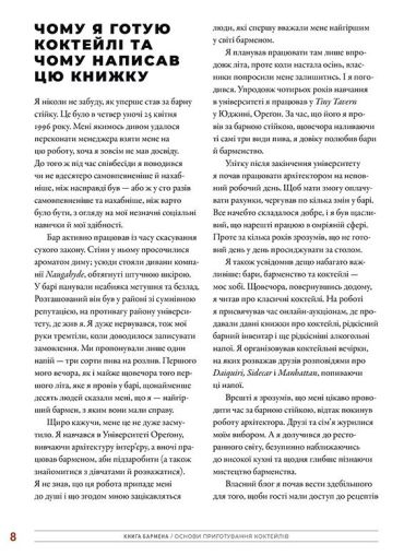 Джеффрі Морґенталер, здобувши диплом архітектора, несподівано обрав справою життя своє хобі — барменство. І досягнув неабияких висот! У цій книжці автор, якого зараз заслужено вважають одним із найзнаменитіших барменів, розкриває перед нами таємниці світу напоїв: які обов’язкові елементи смачного коктейлю, до яких деталей слід проявити увагу, які компоненти краще приготувати самотужки, а які — придбати. Історії виникнення найвідоміших коктейлів, особливості виготовлення і застосування компонентів (соків, сиропів, гарнішів, настойок), техніки змішування напоїв і, звісно ж, рецепти — усе це ви знайдете у цьому посібнику — першому в Україні спеціалізованому виданню для барменів.