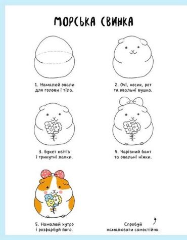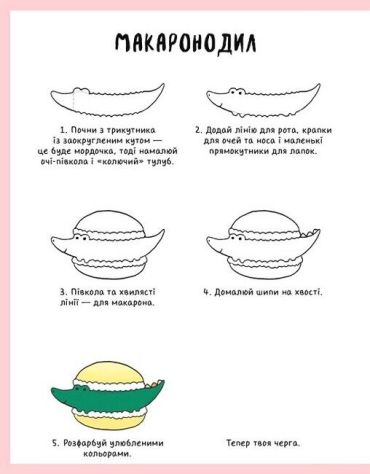 Лише за п"ять крокiв i за допомогою простих фiгур можна створити найдивовижнiшу компанiю у свiтi: елегантного бабака, яскравого макаронодила, милого кролекотика та багато-багато iнших. Намалювати їх легко, головне — робити все поступово,за п’ять крокiв, i за допомогою простих форм та елементiв.