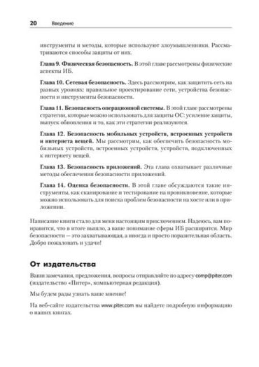 Автор отвечает на все базовые вопросы и на примерах реальных инцидентов рассматривает операционную безопасность, защиту ОС и мобильных устройств, а также проблемы проектирования сетей. Книга подойдет для новичков в области информационной безопасности, сетевых администраторов и всех интересующихся. Она станет отправной точкой для карьеры в области защиты данных.