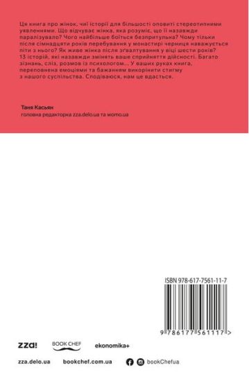Ця книга про жінок, чиї історії для більшості оповиті стереотипними уявленнями. Що відчуває жінка, яка розуміє, що її назавжди паралізувало? Чого найбільше боїться безпритульна? Чому тільки після сімнадцяти років перебування у монастирі черниця наважується піти з нього? Як живе жінка після зґвалтування у віці шести років? 13 історій, які назавжди змінять ваше сприйняття дійсності. Багато зізнань, сліз, розмов із психологом... У ваших руках книга, переповнена емоціями та бажанням викорінити стигму з нашого суспільства.