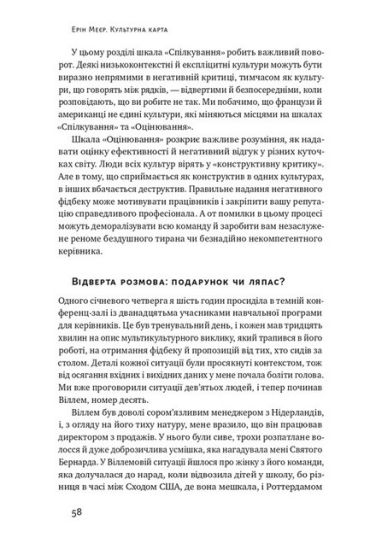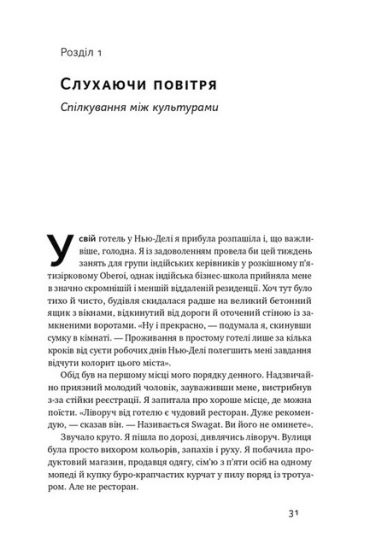 На реальних історіях авторка демонструє, як взаємодіють представники різних культур, аналізує типові помилки, вчить дивитися на ситуацію очима підлеглих чи керівників, що зростали в іншій культурі. Також авторка пропонує дієвий інструмент: восьмишкальну модель, завдяки якій ефективність міжнародної команди зросте в рази.