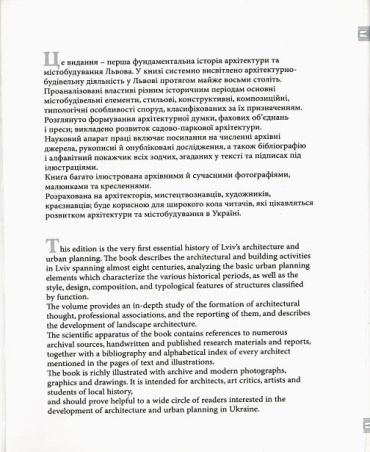 Це видання – перша фундаментальна історія архітектури та містобудування Львова. У книзі системно висвітлено архітектурно-будівельну діяльність у Львові протягом майже восьми століть. Проаналізовані властиві різним історичним періодам основні містобудівельні елементи, стильові, конструктивні, композиційні, типологічні особливості споруд, класифікованих за їх призначенням.