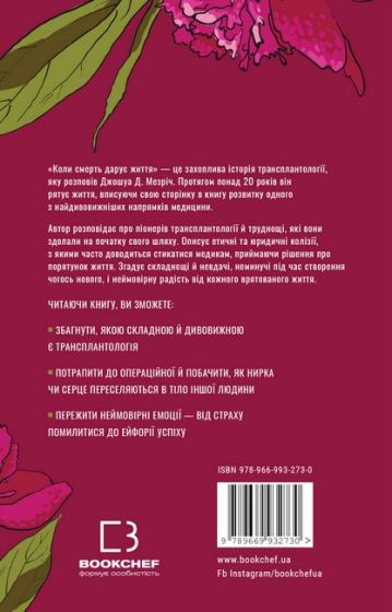 Історія такої звичної на сьогодні операції, як трансплантація тканин та органів однієї людини іншій, триває менш ніж століття. Однак протягом цього часу людство зробило значний крок на шляху до порятунку життів. Про піонерів трансплантології, труднощі, які їм довелося долати, етичні та юридичні колізії, складні рішення й радість від кожного врятованого життя хірург Джошуа Д. Мезріч розповідає в книзі «Коли смерть дарує життя».