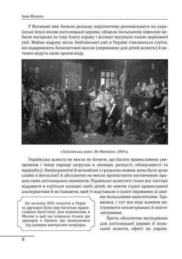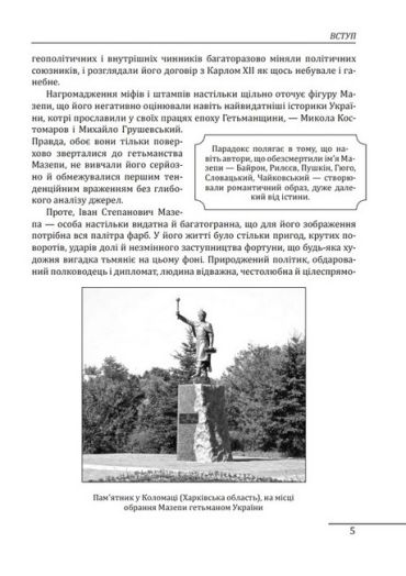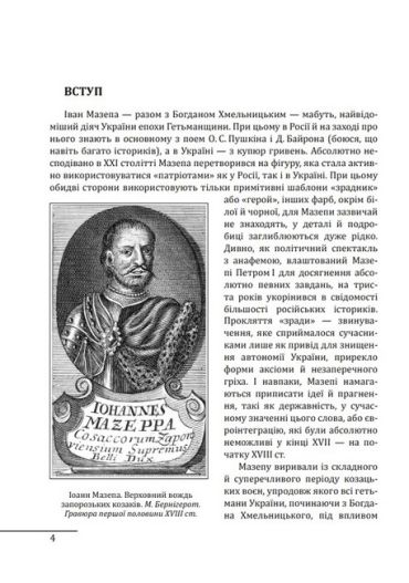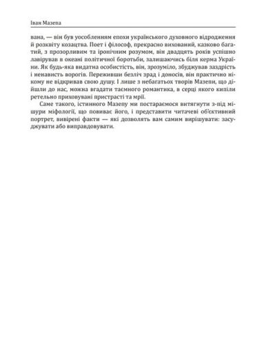 Напевно, немає в українській історії особистості більш суперечливою, яка періодично викликає непримиренні дискусійні баталії в середовищі обивателів і знавців.Черговим приводом для такого сплеску стала свого часу книга Т. Таїрової-Яковлєвої «Іван Мазепа». Це документально обгрунтоване дослідження назвали «першою в Росії правдивою книгою про гетьмана Івана Мазепу». Не зрадник імперії і царя, а неординарна особистість, різнобічно обдарована, неабиякого розуму, сили духу та патріотичної самосвідомості. Ця книга - український переклад тієї самої, гучної, доопрацьований автором. Т. Таїрова-Яковлєва звертається до читача зі вступним словом, дещо за ці роки змінилося у самому «мазепознавстві» – деякі факти і констатації автором відкориговані й доповнені. Все це надає книзі ще більшої наукової цінності й глибини, відкриваючи нам все нового Мазепу...