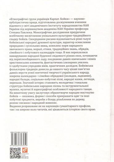 «Етнографічні групи українців Карпат. Бойки» — науково-публіцистична праця, підготовлена досвідченими вченими відомого у світі академічного Інституту народознавства НАН України під керівництвом академіка НАН України професора Степана Павлюка. Монографічне дослідження приурочене всебічному висвітленню унікального культурно-традиційного спадку бойків. Своєрідними рисами відзначаються різні галузі бойківської народної духовної культури, характер осмислення природних і суспільних явищ, комплекс норм народного звичаєвого права, моралі, етики, традиційних знань, обрядів, сімейного і побутового календарів тощо. В них переплелися нашарування народної буденної свідомості різних епох, починаючи від первіснообщинного ладу, поєднання давніх язичеських і пізніх християнських елементів, фантастичних ілюзорних уявлень із здобутками упродовж віків, практичним досвідом. Бойківська фольклорна традиція донесла до нашого часу цікаві пам’ятки давніх верств усної поетичної творчості українського народу, зокрема календарно- і сімейно-обрядової (колядки, ладканки), народні балади, соціально-побутові пісні, народні казки, легенди, перекази. Значний інтерес становить мелодична і тональна структура бойківських народних пісень та інструментальної музики, музичні й хореографічні особливості народного танцю. На виняткову увагу заслуговує образотворче народне мистецтво бойків — вишивка, форми і способи прикрашати одяг та інші побутові предмети, вироби з бісеру, різьблення по дереву, розпис писанок і народний живопис.