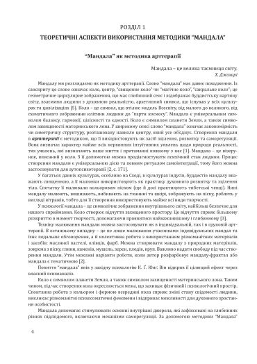 Серед усіх методик роботи в арттерапії “Мандала” є однією з універсальних, що підходить як дорослим, так і дітям. Методичні рекомендації містять теоретичні аспекти роботи з мандалою, а також загальні алгоритми роботи за О. І. Копитіним. У практичній частині подані корекційно-розвиткові заняття з використанням мандал, зокрема створення класичної мандали з різних матеріалів (пісок, каміння, крупи), робота з мандалою-розмальовкою тощо.