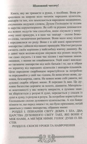 Книга розрахована на широке коло читачів: народних цілителів, знахарів та тих, хто захоплюється народною медициною, лікуванням недужих словом, Духом Господнім та зіллям із царства нерукотворного.