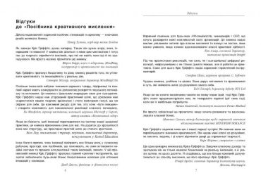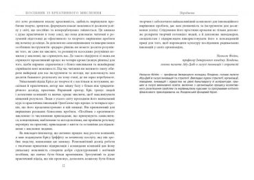 У «Посібнику з креативного мислення» Кріс Ґріффітс і Меліна Кості винайшли відтворювану систему, що дозволяє людям «відкривати» їхній розум і перемагати в боротьбі з професійними викликами, використовуючи силу креативного мислення. Вони демонструють нам, як творчість може бути водночас фантазійною й логічною і як ця традиційно «м’яка сила» може систематично приводити до потужних результатів. Це прекрасне рішення для всіх, хто хоче розвивати власну креативність, здібність вирішувати проблеми творчо, зрештою, формувати власні можливості досягати успіху у світі, що постійно та непередбачувано змінюється. Ця книжка є дуже практичною в тому сенсі, що вона допомагає читачеві в розумовій підготовці до ефективного та творчого вирішення проблем від початку до кінця.