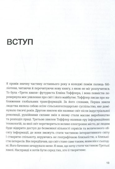 Попереду нас чекає значно ширша концепція – «інтернет усього». Підприємці цього періоду кидатимуть виклик наймогутнішим галузям промисловості світу, галузям, які найсуттєвіше впливають на наші життя. Вони докорінно змінять нашу систему охорони здоров'я та перезавантажать заклади системи освіти. Смороду створювати продукти і служби, які зроблять їжу безпечнішою, а дорогу на роботу простішою», – пише автор у передмові до книжки.