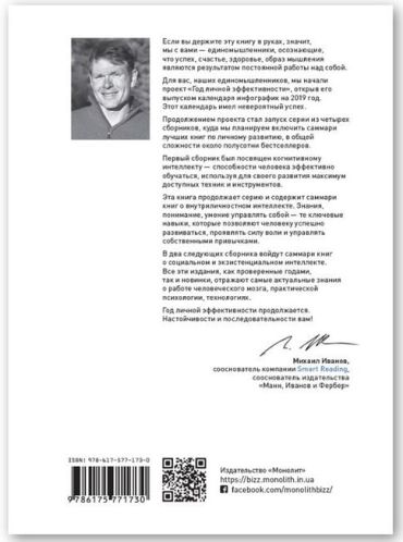 Проект «Рік особистої ефективності» — серія з чотирьох збірок, в кожен з яких входить 10?12 саммари найцінніших книг по особовому розвитку і особистої ефективності. Всі ці книги — безумовний мастрид, гідний зайняти важливе місце в системі знань людини, налаштованого на зростання, і здатний забезпечити для цього сильну основу.