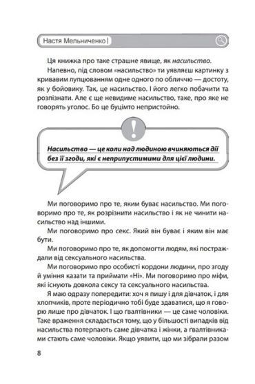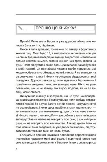 У липні 2016 року мережу Інтернет підірвала потужна акція #ЯНеБоюсьСказати, в якій тисячі жінок і чоловіків розповіли свої історії. Це були дуже сильні і важкі історії - історії про насильство. Ця акція прогриміла не лише в Україні, але й за її межами. Тоді ж почалися розмови про те, що робити, аби не допустити такої кількості насильства в світі. Настя Мельниченко, ініціаторка акції, вирішила написати книжку, в якій розповісти підліткам про те, як не допустити сексуальне насильство зі свого боку, а також як поводитися і до кого звертатися, коли насильство вже сталося.