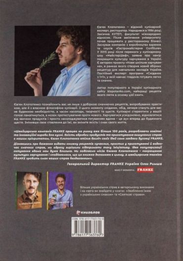«Зваблення їжею. 70 рецептів, які захочеться готувати» – це книжка авторських рецептів відомого українського шеф-кухаря, блогера, чиї матеріали можна прочитати у рейтингових медіа, ведучого літературно-кулінарного шоу на «UA: Суспільне» та кулінарного експерта програми «Сніданок з 1+1» на каналі «1+1», реформатора шкільного харчування та автора першого в Україні кулінарного онлайн-курсу «Міркувати, як кухар» Євгена Клопотенка.