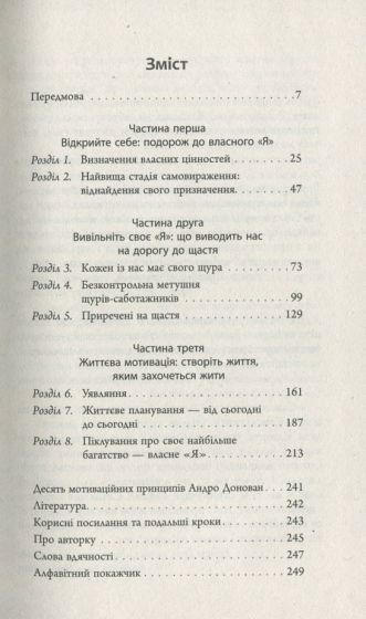 У книжці «Самомотивація» авторка вчить кожного почути своє «Я», відокремити власні бажання від нав’язаних суспільством і жити в гармонії передусім із собою, зі своїми внутрішніми щурами. Пропонована книжка акумулює багаторічний досвід роботи з клієнтами і містить важливі теоретичні зауваги, практичні поради, вправи, виконання яких має наблизити читача до внутрішньої рівноваги, а також реальні історії людей, яким Андро Донован допомогла зрозуміти себе й наважитися на зміни в житті.