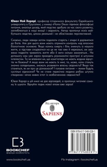 Ювал Ной Харарі, професор історичного факультету Єврейського університету в Єрусалимі, у книжці «Homo Deus» піднімає філософські питання, аналізує досвід, який людство здобуло за час свого розвитку, заглиблюється в наші емоції і свідомість. Автор пропонує ескіз майбутнього людства, цілком реальний і не обов’язково райдужний.