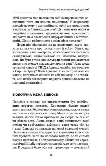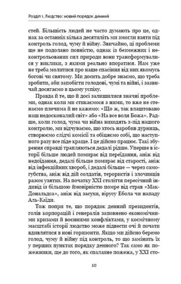 Скажімо, люди завжди хотіли подолати старість і злидні й дорівнятися до богів. Але для цього вони мають отримати контроль над власною біологічною основою. Якщо колись смерть і біль зникнуть із нашого життя, а підстави сподіватися на це не такі вже й нереальні, ми зможемо подвоїти тривалість життя або й жити скільки заманеться… На допомогу нам уже зараз приходять різноманітні пристрої зі штучним інтелектом. Та чи впевнені ми, що комп’ютери не мають жодних відчуттів чи бажань? А якщо вони не мають їх нині, то, може, коли стануть значно складнішими, зможуть розвивати власну свідомість? Якщо так станеться, як ми про це дізнаємося? І головне питання — якими будуть суспільні відносини? Чи не стане пересічна людина рабом штучно створених і вічно живих істот із незбагненною свідомістю?