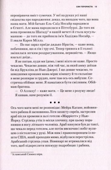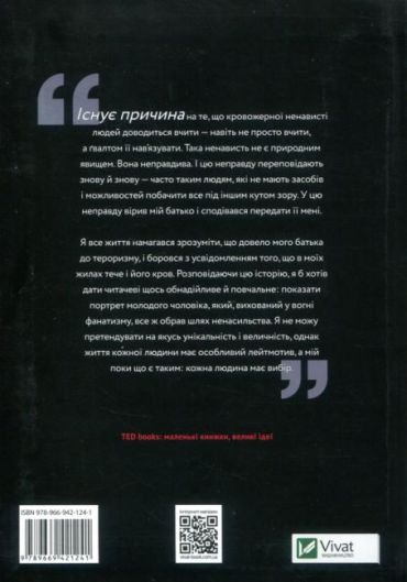 Я все життя намагався зрозуміти, що довело мого батька до тероризму, і боровся з усвідомленням того, що в моїх жилах тече кров. Розповідаючи цю історію, я б хотів дати читачеві щось обнадійливе і повчальне Показати портрет молодого чоловіка, який, вихований у вогні фанатизму, все ж вибрав шлях ненасильства. Я не можу претендувати на якусь унікальність і велич, проте життя кожної людини має особливий лейтмотив, а поки мій такий: кожна людина має вибір.