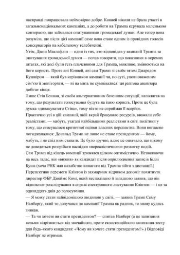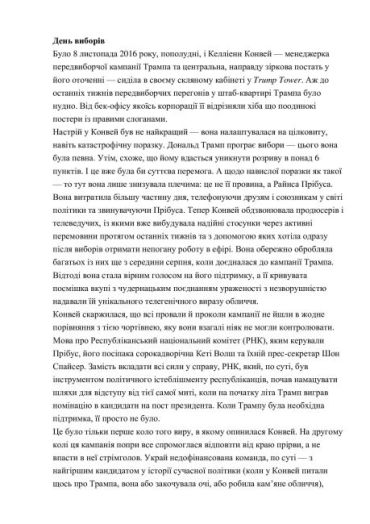 Проте Вулфф пише не лише про політичне, а й про особисте життя президента США. У чому секрет зачіски Трампа? Як він живе із дружиною? Чому підлеглі спілкуються з ним через телешоу? - автор дає відповіді на численні запитання.