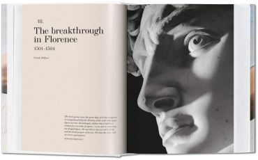 Це нове видання видавництва TASCHEN простежує сходження Мікеланджело до культурної еліти епохи Відродження. Десять багато ілюстрованих розділів охоплюють картини, скульптури, будівлі та малюнки митця, включно з детальним аналізом фресок "Тур де форс" у Сікстинській капелі. Репродукції на всю сторінку та збільшені деталі дозволяють читачам оцінити найдрібніші деталі в репертуарі художника, тоді як біографічний нарис книги розглядає більш особисті риси та обставини життя Мікеланджело, такі як його відлюдькуватість, жага до грошей та замовлень, його величезне багатство та вміння інвестувати в нерухомість.