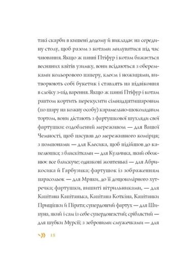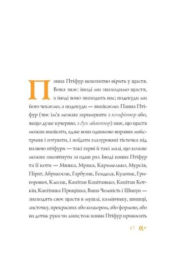 Якщо вам подобаються книжки, в яких не надто багато бурхливих подій, книжки, в яких коти і люди влаштовують біля річки пікнік з булочками та морквяними мечами, книжки з грою слів, римами і довгими списками — ви обрали те, що треба. І не біда, якщо у вас під рукою немає підхожої скатертини. Панна Птіфур упевнена: чудові пригоди можна пережити, просто глянувши в обличчя дорогої твоєму серцю людини.